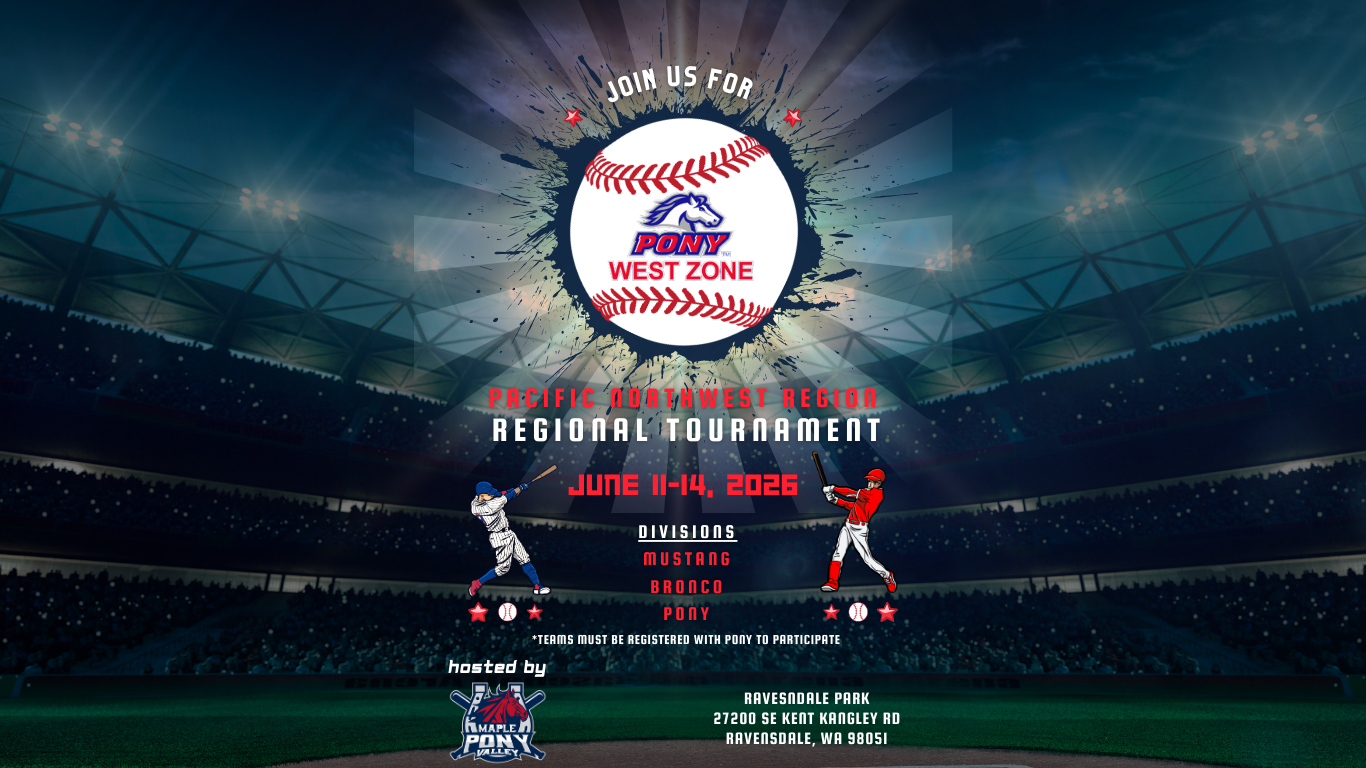 Join us for the 2026 PONY Northwest Regional Tournament, hosted by Maple Valley PONY Baseball, from June 11–14, 2026 at beautiful Ravensdale Park in Ravensdale, Washington. This exciting event will bring together top teams from across the region in the 9U–14U divisions for four days of competitive baseball, great sportsmanship, and unforgettable memories.